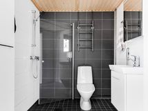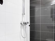 Pesutilojen kuvaus: WC-istuin, suihkuseinä, suihku, bidee-suihku, pyyhekuivain, lattialämmitys, peilikaappi, allaskaappi, Lattia: Laattaa, Seinä: Kaakelia.