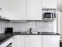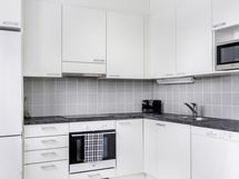 Keittiön varusteet: Jääkaappipakastin, uuni, liesi, astianpesukone ja liesituuletin. Liesi: Keraaminen liesi.