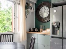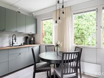 - Keittiön varusteet: Jääkaappipakastin, uuni, liesi, liesituuletin, astianpesukone ja mikroaaltouuni. Liesi: Induktioliesi. Työtason materiaali: Laminaatti. Keittiön kodinkoneet integroitu, pois lukien jääkaappi/ pakastin.