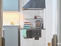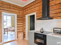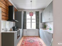 - Tyylikäs vuonna 2020 uusittu keittiö. Varustus: induktioliesi, yhdistelmäuuni (kiertoilmauuni/mikroaaltouuni), integroitu astianpesukone, liesituuletin, jääkaappipakastin (2025) ja integroitu pyykinpesukone. Työtasot: kvartsi (Calacatta Gold). Seinät: kvartsi ja hirsi. Lattia: lankku.