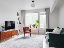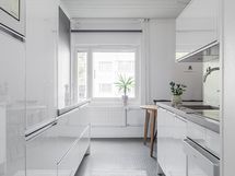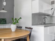 - Työtaso: Betonitaso. Jääkaappi/pakastin, erillisuuni, induktioliesitaso, integroitu mikroaaltouuni, integroitu astianpesukone