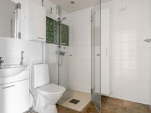 - Suihku, suihkuseinä, peilit, kaapit, allaskaappi, pesukoneliitäntä, lattialämmitys, kiinteät valaisimet.