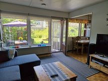 - Valoisista olohuoneen isoista ikkunoista vehreät näkymät ilta-aurinkoiselle hoidetulle puutarhapihalle. Screenrullaverhot ja keittiön sälekaihtimet sisältyvät kauppaan.