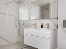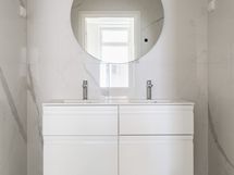 - Pesutilojen varusteet: WC-istuin, suihku (kaksi suihkua), peili, pesuallas (kaksi pesuallasta ja hanaa), allaskaappi, bidee-suihku, lattialämmitys, pesukoneliitäntä (pesukoneliitäntä erillisessä komerossa) ja suihkuseinä (suihkut kahdella puolella kylpyhuoneen päätyä). Pesutilojen kuvaus: Upeilla, suurilla Laattapisteen keraamisilla 120x120 ja 48x48 laatoilla varustettu, tasokas kylpyhuone. Erillisten WC:n lukumäärä: 1. Erillisen WC:n varusteet: WC-istuin, pesuallas (kaksi allasta ja kaksi hanaa), peili, bidee-suihku, lattialämmitys ja allaskaappi. Erillisen WC:n kuvaus: Upeilla, suurilla Laattapisteen keraamisilla 120x120 ja 48x48 laatoilla varustettu, tasokas wc.