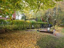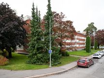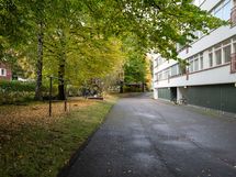 - Lehtipuiden täyttämä piha- ja katunäkymä