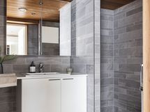 - Pesutilojen kuvaus: Seinäwc-istuin, allaskaapisto, kivitaso (valkoinen), peilikaappi, suihku ja pk-liit.