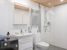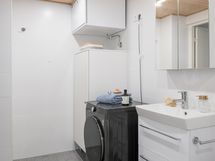 Laatoitetut lattiat ja seinät. Lattialämmitys, pesukoneliitäntä, suihku, suihkuseinä, bideesuihku ja wc-istuin. Seinäkaappi, allaslaatikosto, allashana, allas ja peilikaappi.