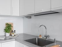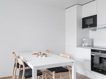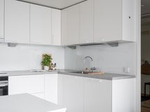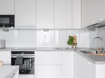 Tamminen parkettilattia, maalatut seinät. Laminaattitasot, välitila lasia. Valkoiset laakapintaiset keittiökaapistot. Liesi, liesituuletin, uuni, mikroaaltouuni, astianpesukone ja jääkaappi-pakastin.
