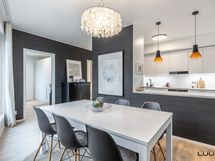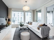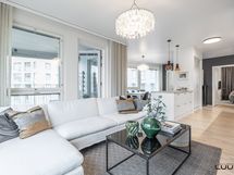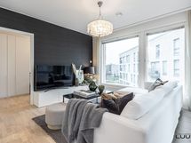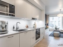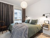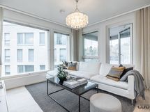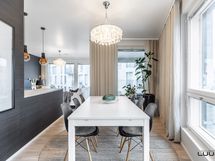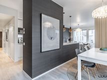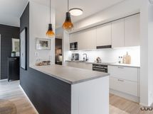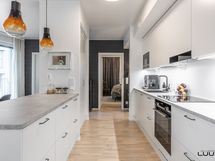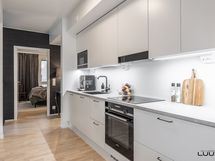- Vaaleassa keittiössä varusteena täysimittaiset jää- ja pakastinkaapit, induktioliesi, erillisuuni, liesituuletin (suodatin), astianpesukone ja mikroaaltouuni. Työtasot laminaattia. Leveä saareke tuo keittiöön lisää säilytys- ja laskutilaa.