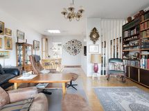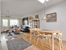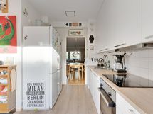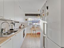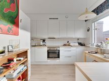 - Keittiön varusteet: 2 x jääkaappipakastin (Siemens), erillisuuni (Siemens), liesi (Siemens, induktio), astianpesukone (Siemens) ja liesituuletin (Electrolux). Vaaleat kaapistot ja välitilalaatat, tasot laminaattia.