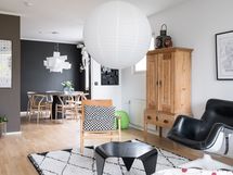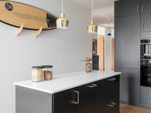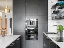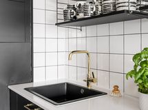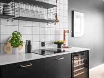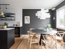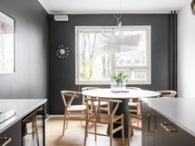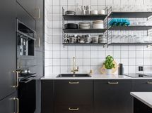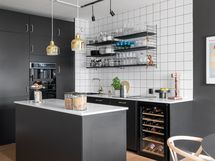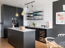 - Korkkilattia, maalatut/laatoitetut seinät. Mustat kaapistot (Ikea). Uuni, liesi integroidulla tuulettimella, kahvikone, viinikaappi, astianpesukone ja jääkaappi-pakastin.