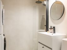 Mikrosementöidyt lattia ja seinät. Allas, allashana, allaslaatikosto, peili valotoiminnolla, bideesuihku, wc-istuin, suihku, suihkuseinä, kaapisto, pesukoneliitäntä ja pyyhepatteri. Erillisen WC:n kuvaus: Erillinen wc: