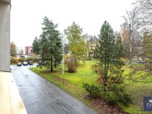 - Parvekkeelta avarat näkymät pihalle etelään. Keittiöstä ja makuuhuoneesta näkymä pohjoiseen puistokaistaleelle, kauempana taloja.