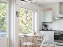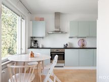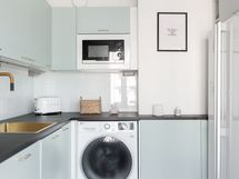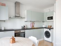 VARUSTELU: Allas, hana, integroitu mikro, liesituuletin, induktioliesi, uuni, astianpesukone, jääkaappi ja pakastin. Keittiössä lisäksi paikka pyykinpesukoneelle.