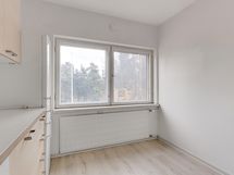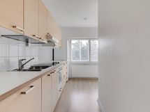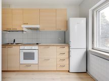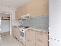 - Keittiön varusteet: Jääkaappipakastin, liesituuletin, astianpesukoneliitäntä ja erillisuuni. Liesi: Keraaminen liesi. Työtason materiaali: Laminaatti.