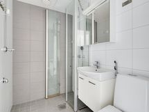 - Pesutilojen varusteet: Suihku, wc-istuin, suihkuseinä, pesukoneliitäntä, peilikaappi ja pesuallas.