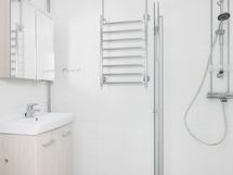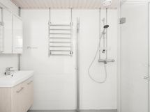 - Pesutilojen varusteet: WC-istuin, pesukoneliitäntä, lattialämmitys, peilikaappi, pesuallas, allaskaappi, bidee-suihku, suihkuseinä ja suihku.