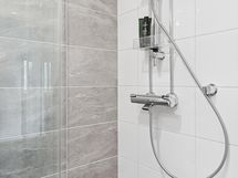 - Peili, allaskaappi, pesukoneliitäntä, kylpyhuonekaapisto, kiinteät valaisimet, suihku, kaarevat suihkuovet, lattialämmitys sähkö