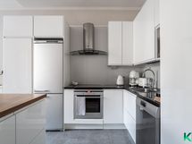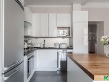 - Jääkaappi/pakastin, mikroaaltouuni, astianpesukone, kaapistot, saareke, keraaminen liesi, erillisuuni- ja taso, liesikupu/-tuuletin, keittiön katossa halogeenivalaisimet ja seinävalaisimet, verhotanko