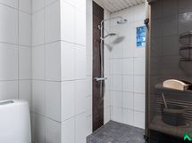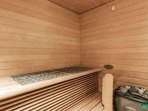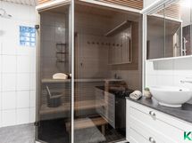 - Kylpyhuone, suihku, peilikaappi, kiinteät valaisimet, allaskaappi, moduulisauna, sähkökiuas, pyyhekoukut, wc-istuin, allas ja hana, lattialämmitys