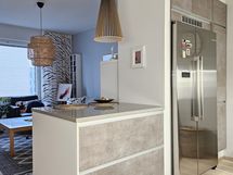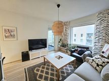 Länteen avautuvat suuret ikkunat ja lasitettu parveke päästävät luonnonvalon tulvimaan sisään ja tarjoavat ihanan rauhallisen paikan päivän päätteeksi. Rakennusvaiheessa asuntoon on tehty harkittuja lisätöitä laadusta tinkimättä: säilytystilaa on lisätty älykkäästi, ja käytännöllinen vaatehuone viimeistelee toimivan arjen. Talo on Skanskan rakentama vuonna 2020.