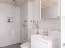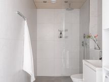 - Pesutilojen kuvaus: Kylpyhuoneessa sadesuihku, suihkuseinä, allaskalusteet, allas ja hana, peilikaappi, kaapisto ja paikka pyykinpesukoneelle. Seinät ja lattia laattaa. Lattialämmitys. .