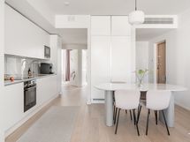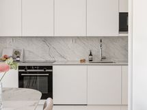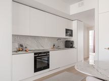 - Kauniissa keittiössä valkoiset kaapistot ja keramiikkapintainen työtaso. Integroituna jääkaappi, pakastin, astianpesukone, liesituuletin, induktioliesi, kalusteuuni ja mikroaaltouuni.