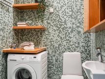 - Kylpyhuone: Pesukoneliitäntä, suihku/suihkukaappi, pesukone, kiinteät seinähyllyt, peilikaappi