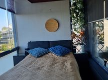 - Parvekkeen lattia on harmaata tyylikästä palamateriaalia. Uudet aurinkoverhot, jotka liikkuvat sivusuunnassa ja tuovat tyylikkyyttä sisä- ja myös ulkopuolelle.