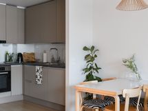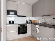 - Keittiön varusteet: Jääkaappipakastin, uuni, astianpesukone, mikroaaltouuni ja liesituuletin. Liesi: Induktioliesi. Työtason materiaali: Laminaatti.