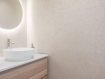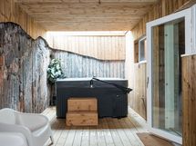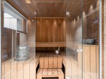Kellarikerroksen saunaosasto on täydellinen rentoutumisen paikka. Saunan yhteydessä on katettu ulkotila kiviseinämällä sekä ulkoporeallas, joka kutsuu viihtymään vuodenajasta riippumatta.