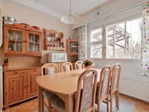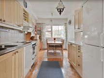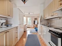 - Keittiön varusteet: Jää-viileäkaappi, jääkaappipakastin, astianpesukone ja liesi. Liesi: Sähköhella ja valurautaliesi. Työtason materiaali: Laminaatti.