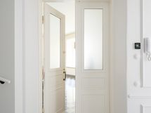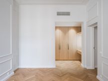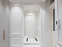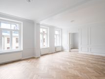 Lattia: huikean kaunis vaaleasävyinen Hörning kalanruotoparketti. Seinät: maalattu, Tikkurilan sävy G487. Katto: maalattu, Tikkurilan valkoinen.