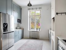 - Korkealaatuinen Saari-keittiö: jääkaappi, pakastin, viinikaappi, kaasuliesi, liesituuletin/aktiivihiilisuodatin, astianpesukone, kaapistot, kivitasot. Keittiössä myös alkuperäinen takka (on nuohottu, toimintakunto pitää tarkistaa).