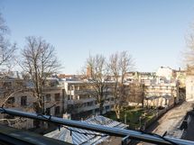 Ranskalainen parveke (noin länteen) ja suurelta terassiparvekkeelta avarat puistopihanäkymät noin pohjoiseen (tarkemmin luoteen ja pohjoisen väliin. Aurinko alkaa paistamaan terassille kuintenkin jo iltapäivällä.