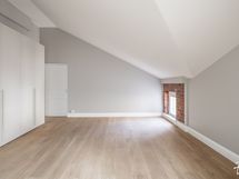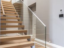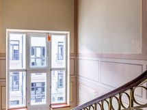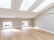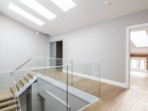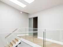 • Porraskäytävän yläpuolella olevat kattoikkunat tuovat valoa molempiin kerroksiin ja huonekorkeus on noin 8 metriä