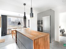 - Kaapistot ja saareke, jääkaappi/pakastin, viinikaappi, erillisuuni, mikroaaltouuni, astianpesukoneliitäntä, keraaminen liesi, liesituuletin filtterillä. Kodinkoneet Miele, viinikaappi Dometic.
