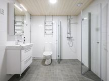 - Pesutilojen varusteet: Suihkuseinä, pesukoneliitäntä, wc-istuin, peilikaappi, suihku, allaskaappi, kiinteät valaisimet ja peili. Pesutilojen kuvaus: Kaksi kylpyhuonetta, toisessa pesukoneliitäntä, molemmissa suihkut,.
