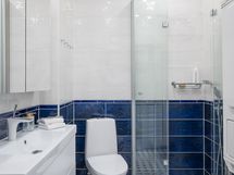 Laatoitetut seinät ja lattia. Sadesuihku ja käsisuihku. Allas, allashana, allaslaatikosto, peilikaappi, korkea kaappi, bideesuihku ja wc-istuin. Lattialämmitys ja pesukoneliitäntä. Pyyhepatteri.