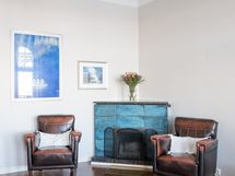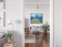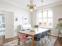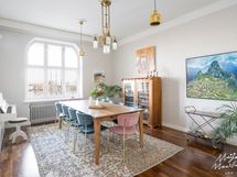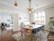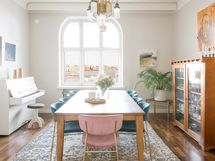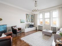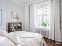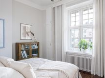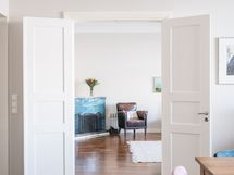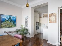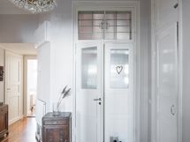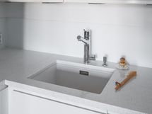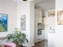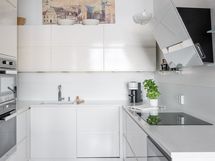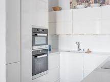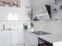 Maalatut seinät ja parkettilattiat. Valkoiset keittiökaapistot. Kvartsitasot. Allas, allashana, Mielen jääkaappi-pakastin, astianpesukone, uuni, liesi, mikroaaltouuni ja viinikaappi. Liesituuletin.