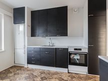 - Työtason materiaali: Laminaatti. Kaapistot, tasot, jääkaappi/pakastin, keraaminen liesi, integroitu astianpesukone (45 cm). Välitila: Levy.