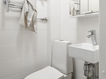- Pesutilojen varusteet: WC-istuin, sadesuihku, allaskaappi, suihku ja peilikaappi. Pesutilojen kuvaus: Kylpyhuone on remontoitu moderniksi ja toimivaksi kokonaisuudeksi. Vaaleat seinälaatat ja selkeälinjainen kalustus tekevät tilasta raikkaan ja helppohoitoisen. Suihkutila on kompaktisti sijoitettu ja varustettu sekä yläsuihkulla että käsisuihkulla, mikä tuo arkeen mukavuutta.