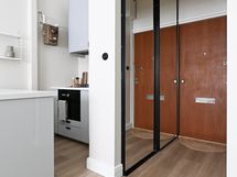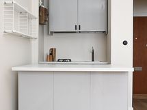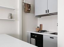 - Keittiön varusteet: Jääkaappi, jääkaappipakastin, uuni, liesituuletin ja kaasukeittotaso. Liesi: Kaasukeittotaso. Työtason materiaali: Laminaatti. Valoisa ja toimiva keittotila, joka on remontoitu moderniin, selkeään tyyliin. Kiiltävät harmaat kaapistot tuovat tilaan raikkautta ja tarjoavat hyvin säilytystilaa. Työtasot ovat käytännölliset ja helppohoitoiset, ja kokonaisuus istuu hyvin asunnon kompaktiin pohjaan.