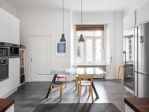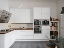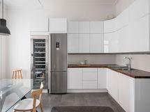 - Todellinen kulinaristin unelma! Laadukkaasti varusteltu tilava erillinen keittiö, joka on uusittu täydelllisesti n. 10 v sitten. Varustus: induktio-kaasuliesi, erillisuuni höyrytoiminnalla sekä mikroaaltouuni-uuni -yhdistelmä, täyskorkea viinikaappi, jääkaappi-pakastin, integroitu astianpesukone. seinämallinen liesituuletin, integroitu kahvikone, kaikki AEG. Lattia on keraamista laattaa, välitila kaakelia, seinät maalattu. Työtasot pähkinäpuuta. Avohyllystö kuuluu kauppaan. Keittiön puukaihtimet kuuluvat kauppaan. Keittiöön on myös erillinen oma sisäänkäynti (B-portaasta). Em. ovesta on kulku B-portaan kautta asunnon vintille.