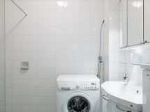 - Pesutilojen kuvaus: Tilava kylpyhuone on kokonaisuudessaan uusittu LVI-saneerauksen yhteydessä. Lisäksi kalusteet on uusittu n. 10 v sitten (kiiltävänvalkoiset). Varustus: suihku, suihkuseinä, WC-istuin, pesukoneliitäntä, allaskaappi, peilikaappi, pyyhekuivain, bideesuihku, pesukone, Lattia laattaa, seinät kaakelia.