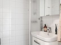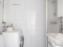 - Kylpyhuone, suihku, peilikaappi, pesukoneliitäntä, allaskaappi, suihkuseinä. Lattia: Laatta. Seinät: Laatta