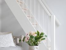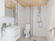 - Pesutilojen varusteet: WC-istuin, suihku, suihkuseinä, pesukoneliitäntä, lattialämmitys, pesuallas, allaskaappi, peilikaappi ja bidee-suihku. Pesutilojen kuvaus: Ajattomilla pintamateriaaleilla varustettu tilava kylpyhuone. Paikka pesutornille.