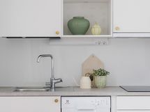 - Keittiön varusteet: Liesituuletin, erillisuuni, liesi, jääkaappipakastin ja astianpesukone. Liesi: Induktioliesi. Työtason materiaali: Laminaatti. Valkoinen keittiö jossa laminaattitasot, kultaiset nuppivetimet ja valkoiset Electroluxin kodinkoneet. Keittiö lähes käyttämätön.