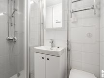 Pesutilojen kuvaus: wc-istuin, bidee, suihku, kääntyvät suihkuseinät, peilikaappi, pesuallas, allaskaapisto, kuivauspatteri. Lattia: laatta. Seinät: kaakeli0.