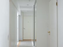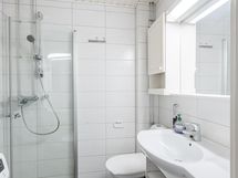 - Kylpyhuone, suihkuovet, suihku, peilikaappi, allaskaappi, allas, mukavuuslattialämmitys, pesukoneliitäntä, pyyhekuivain, wc-istuin.
